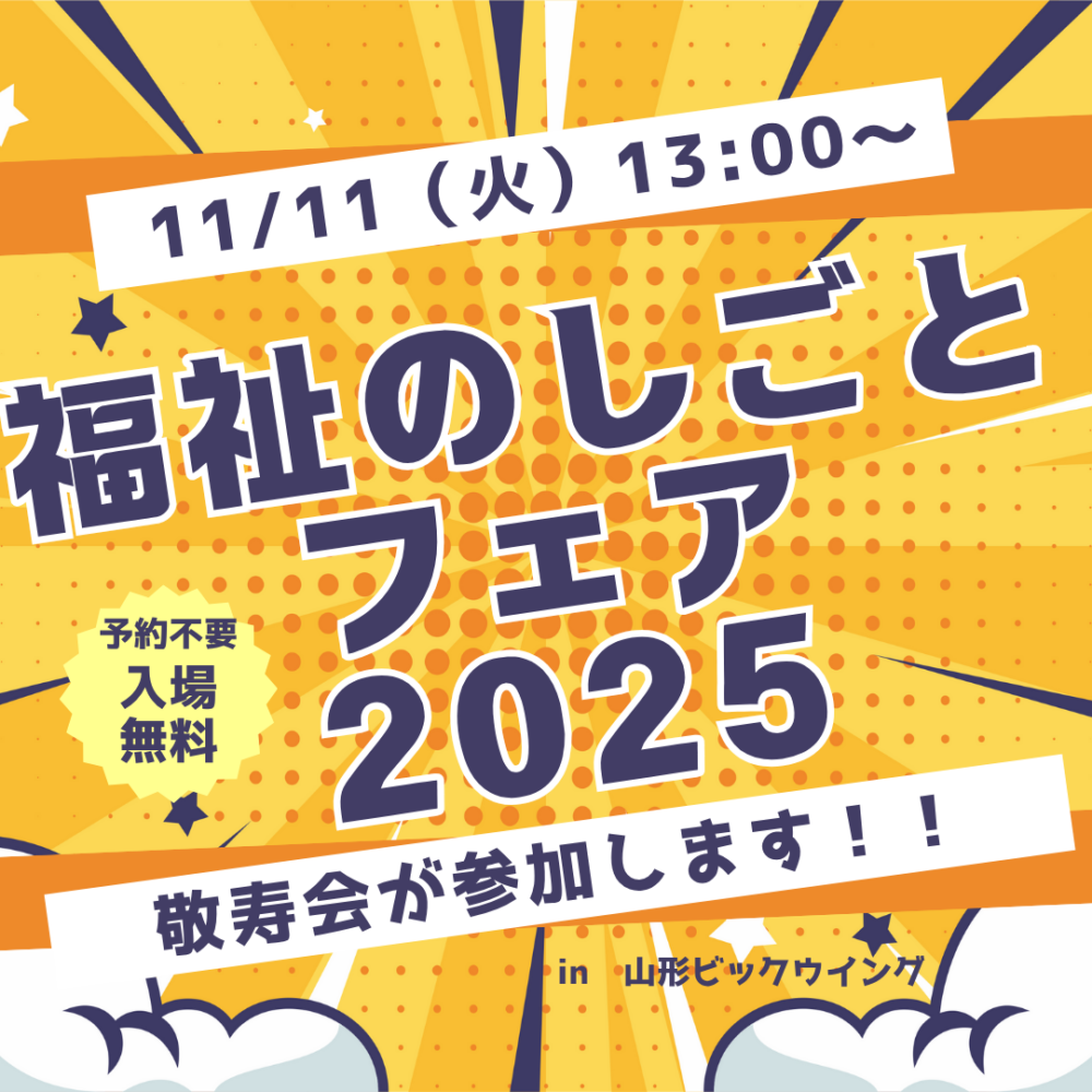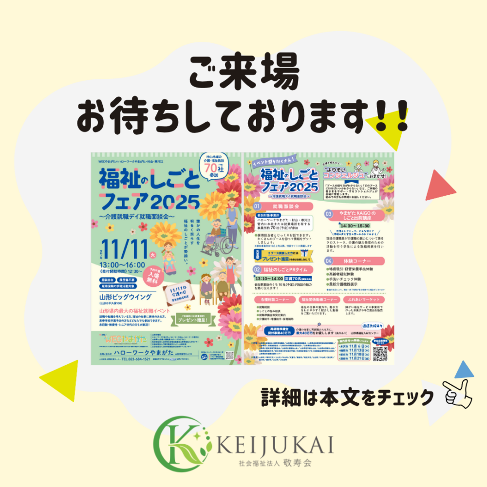 令和7年11月11日(火) 山形市、山形ビックウイングにて開催されます「#福祉のしごとフェア2025 」に #社会福祉法人敬寿会 が参加させていただくこととなりました🎉