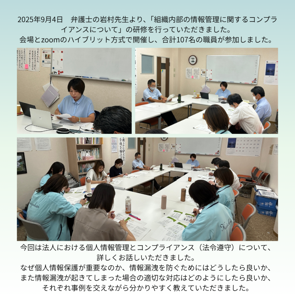 2025年9月4日 弁護士の岩村先生より、「組織内部の情報管理に関するコンプライアンス」の研修を行っていただきました。