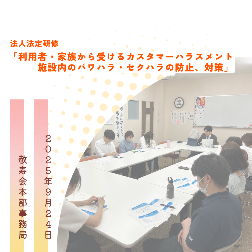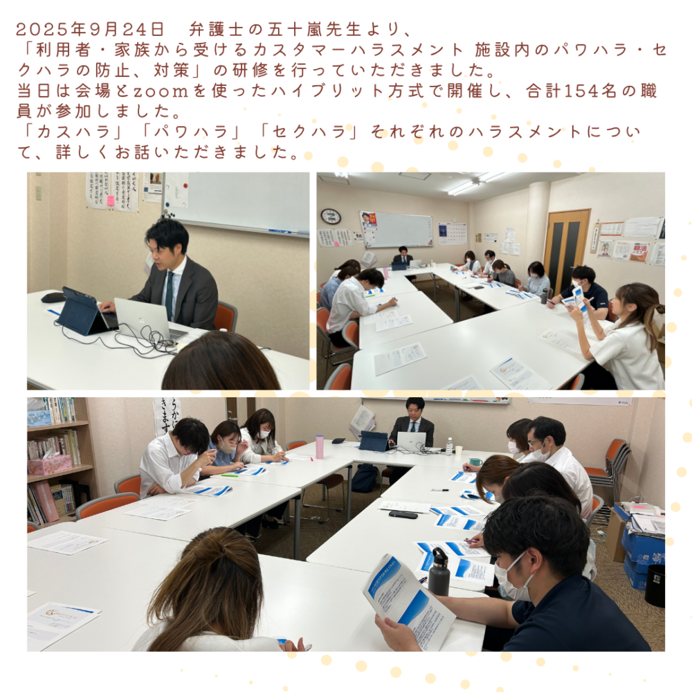 2025年9月24日 弁護士の五十嵐先生より、「利用者・家族から受けるカスタマーハラスメント、施設内のパワハラ、セクハラの防止、対策」についての研修を行っていただきました。