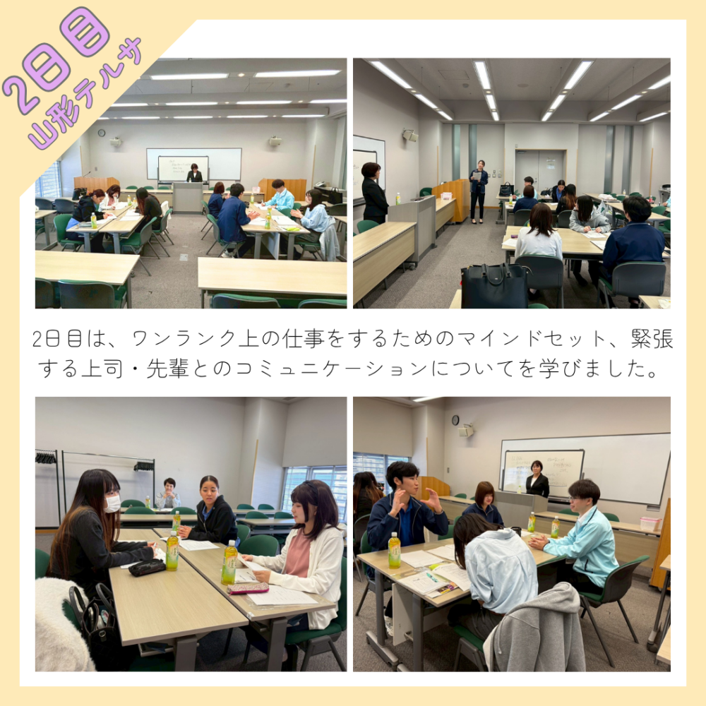 2日目は、「ワンランク上の仕事をするためのマインドセット」、「緊張する上司・先輩とのコミュニケーションについて」を学びました。