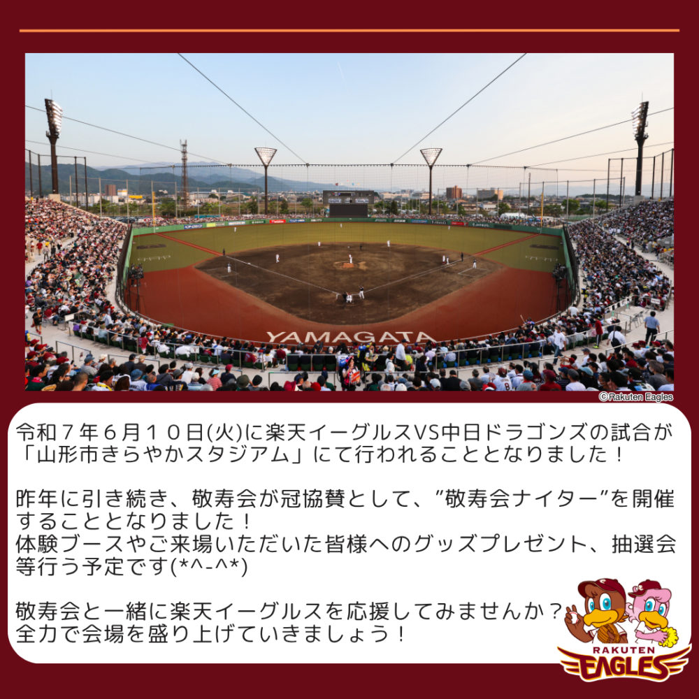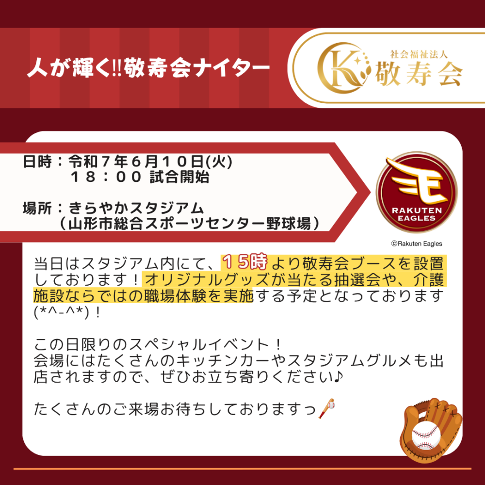 「山形市きらやかスタジアム」にて“敬寿会ナイター”を開催いたします!