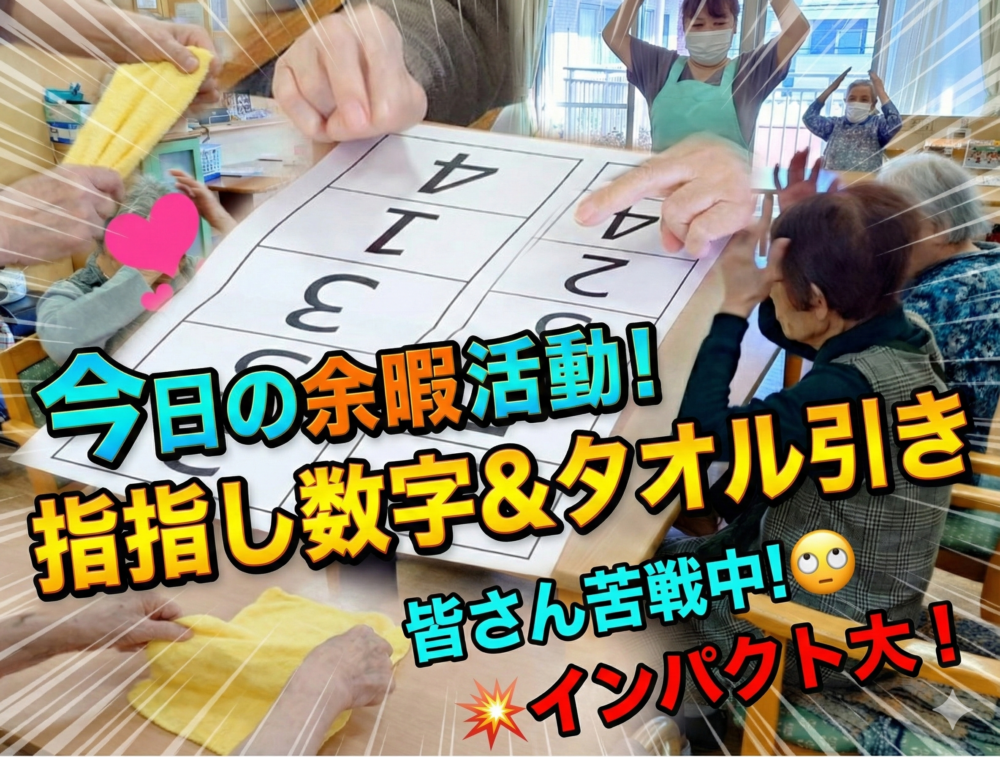 【本日の余暇活動】今日は「指指し数字」と「タオル引き」を行いました😊