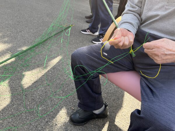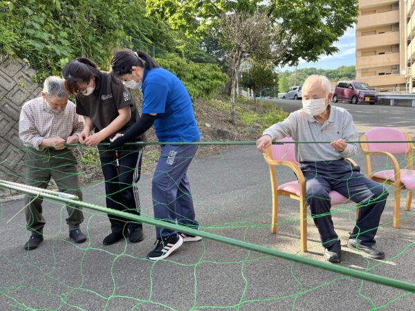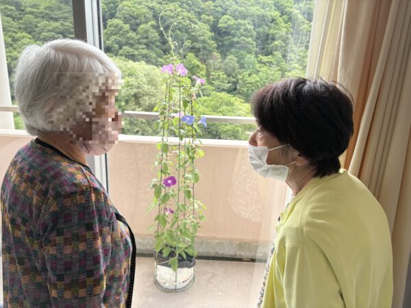 5月末に利用者様と朝顔の種を植えましたが、2週間ほどで無事に芽が出たのでプランターへの植え替えを行いました。