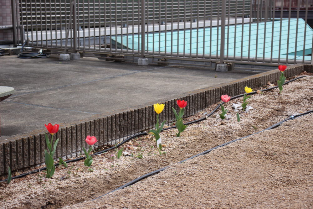 屋上に咲いたチューリップと桃の花