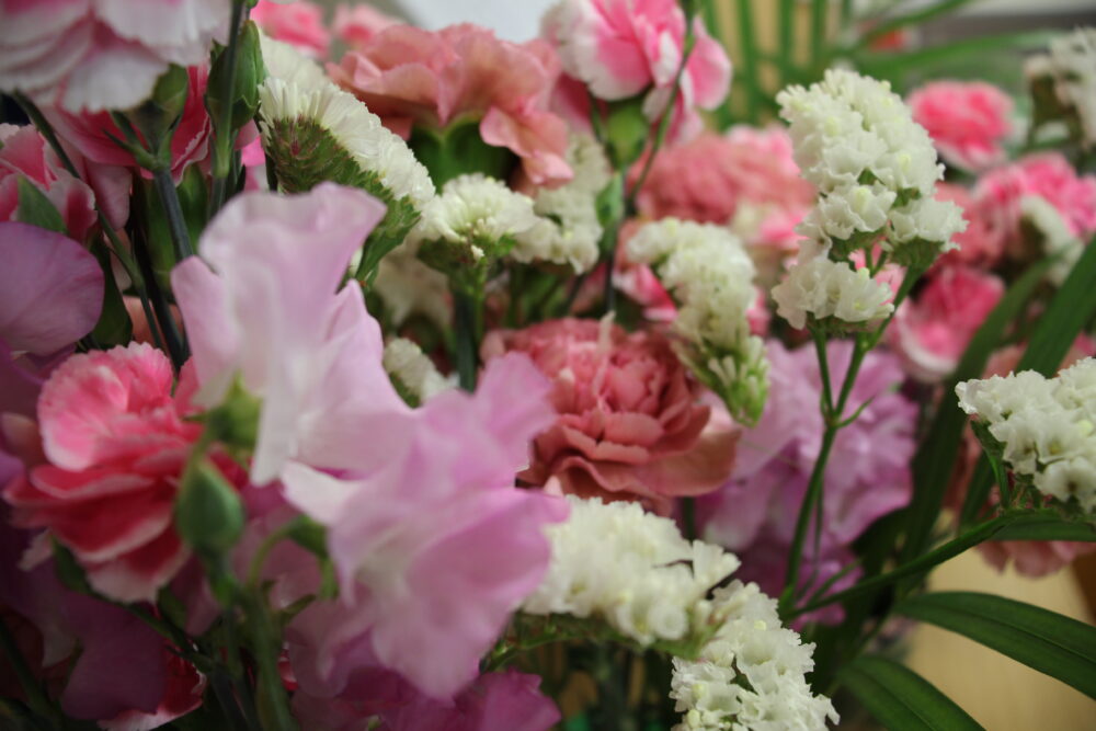 3月最終日曜日にはフラワーアレンジメントを行い様々な色調のピンク色の花たち(カーネーション、スターチス、スイートピー)を愛でながら楽しまれていました。