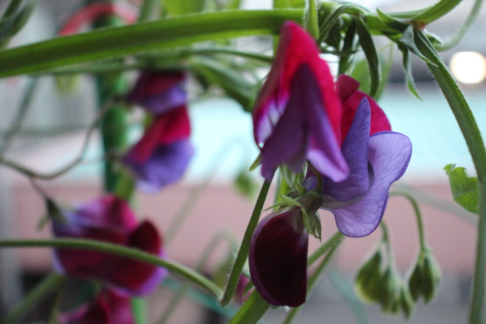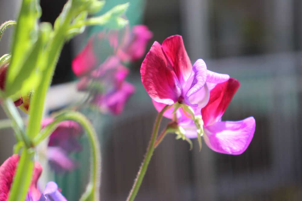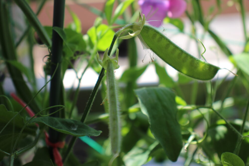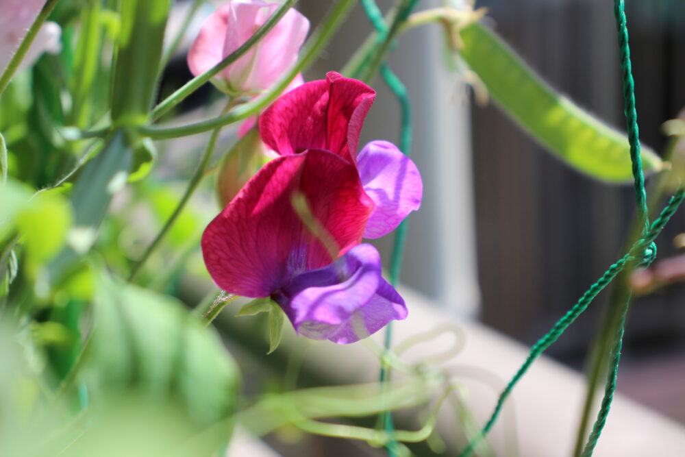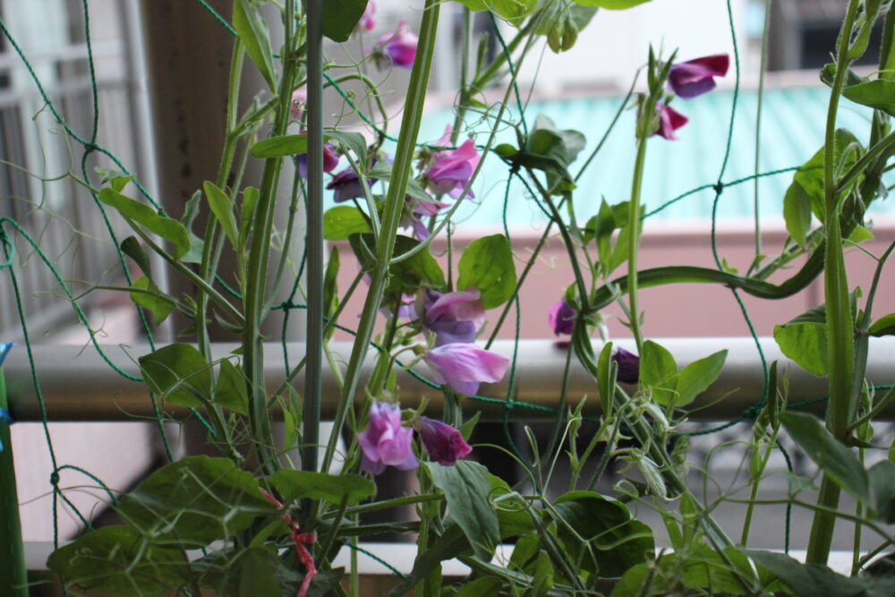 2Fベランダのプランターに伸びたつるの間からきれいな紫とピンクの花が顔をだしているのはスイートピーです。職員が無造作にまいたまんまるの種がもやしのような芽をだして花を咲かせ、一部はさやを付けています。今年は枯れたさやから種を取り出して来年に向けて準備する予定です。