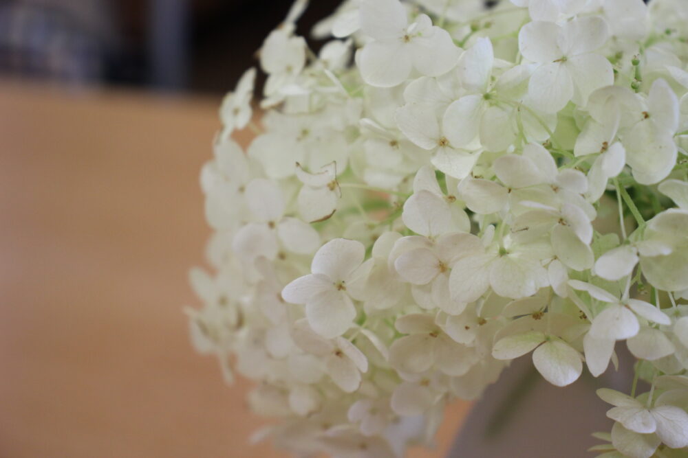 右写真は手のひらに乗る程小さな鉢に植えられたお花。テーブルに置いて入居者様にお世話をお願いしています。