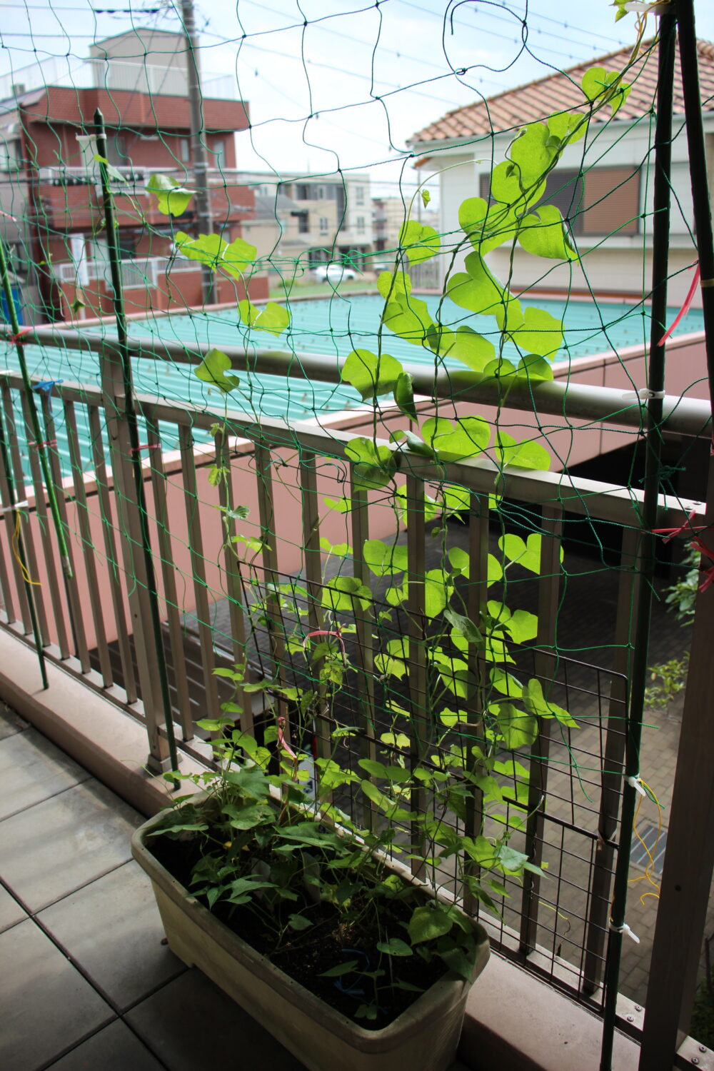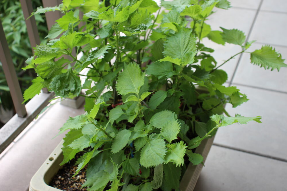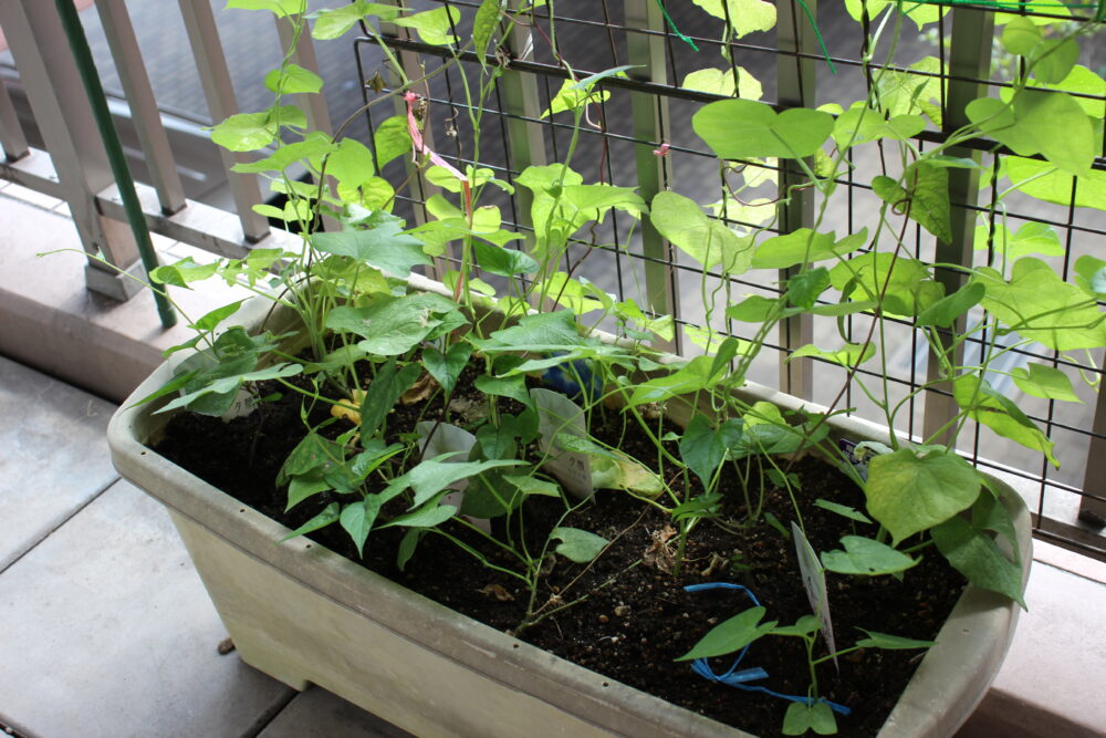 朝顔、夕顔も大きくなりつるを伸ばして元気に育っています。入居者様が毎朝水やりしていただているおかげで大葉も大きくなりました。
