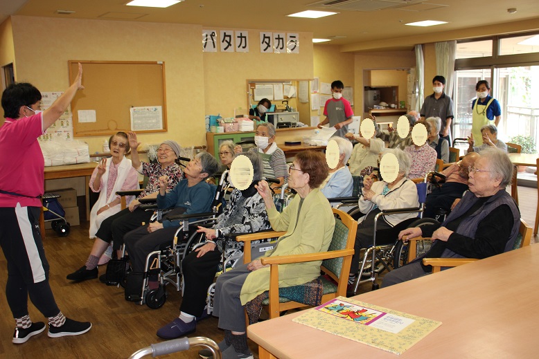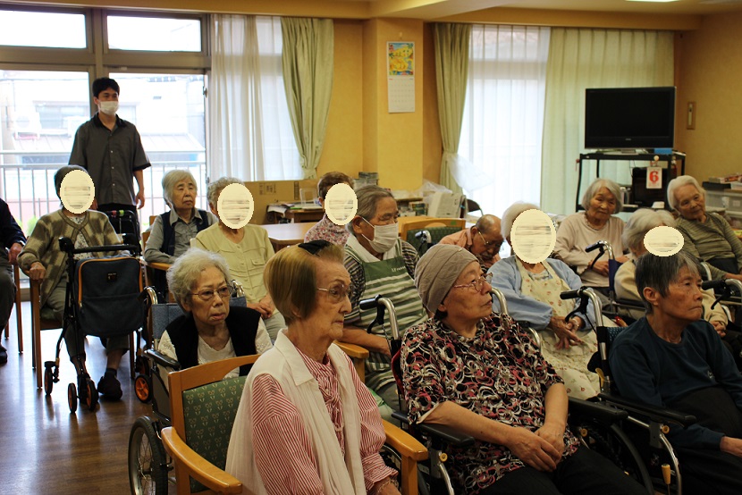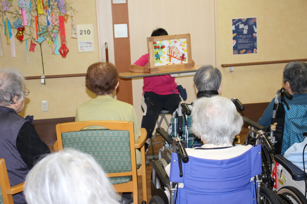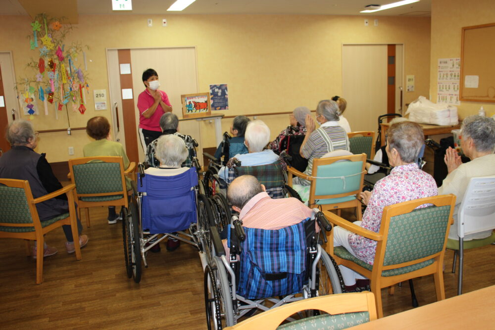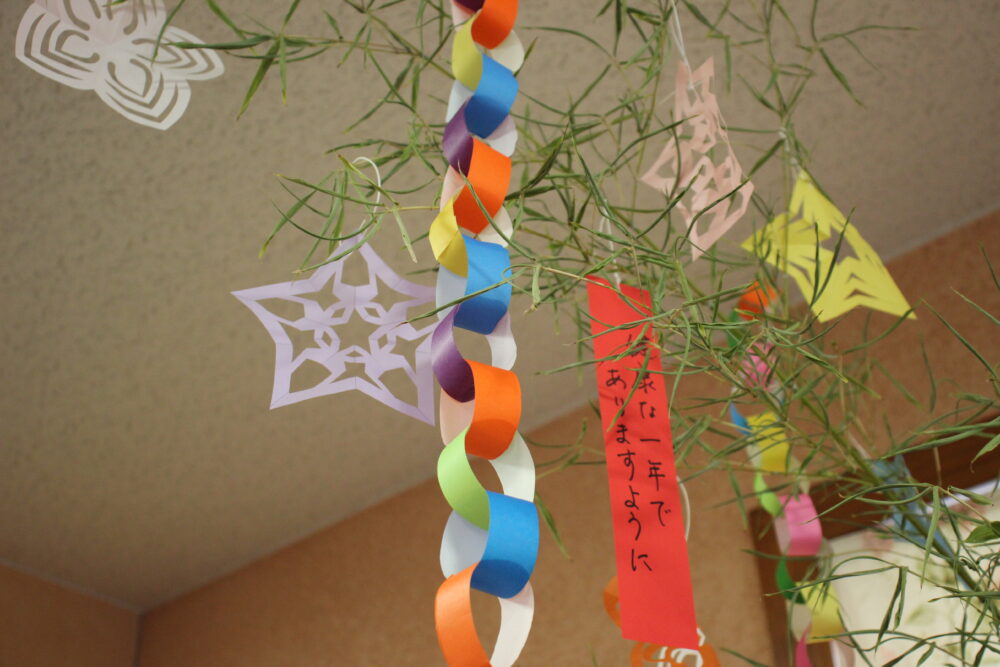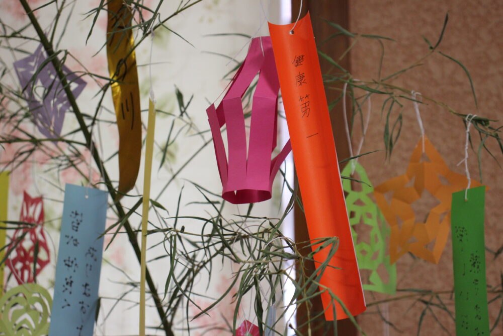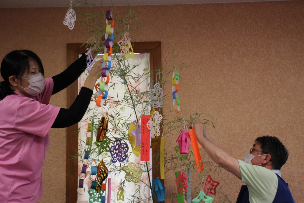入居者様と共に、笹に七夕飾りを飾り付けました。