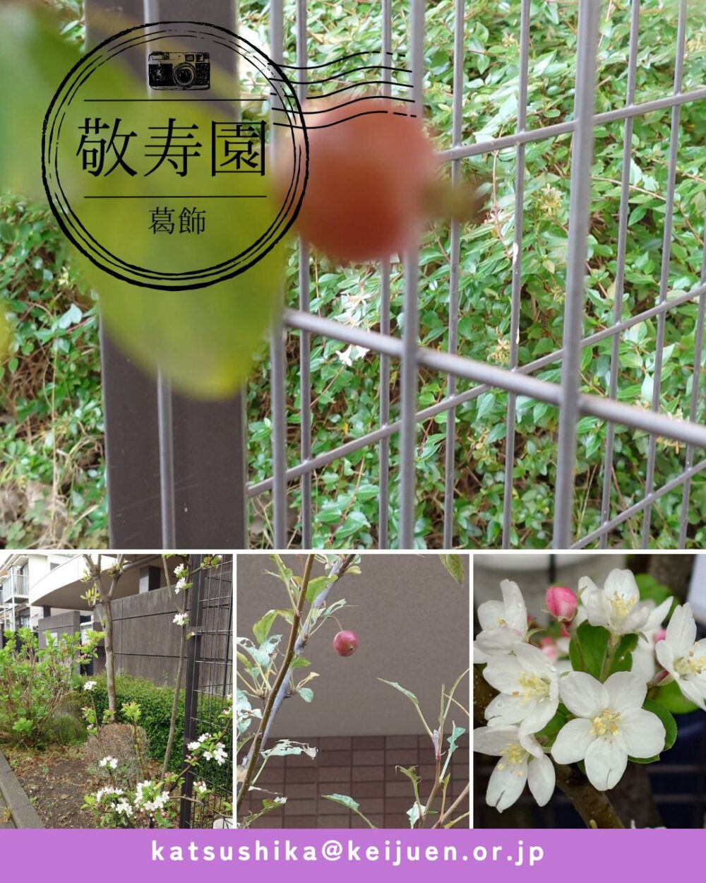 ケアハウス葛飾敬寿園の正面入り口では、今年も姫りんごが可愛い花を咲かせています。
