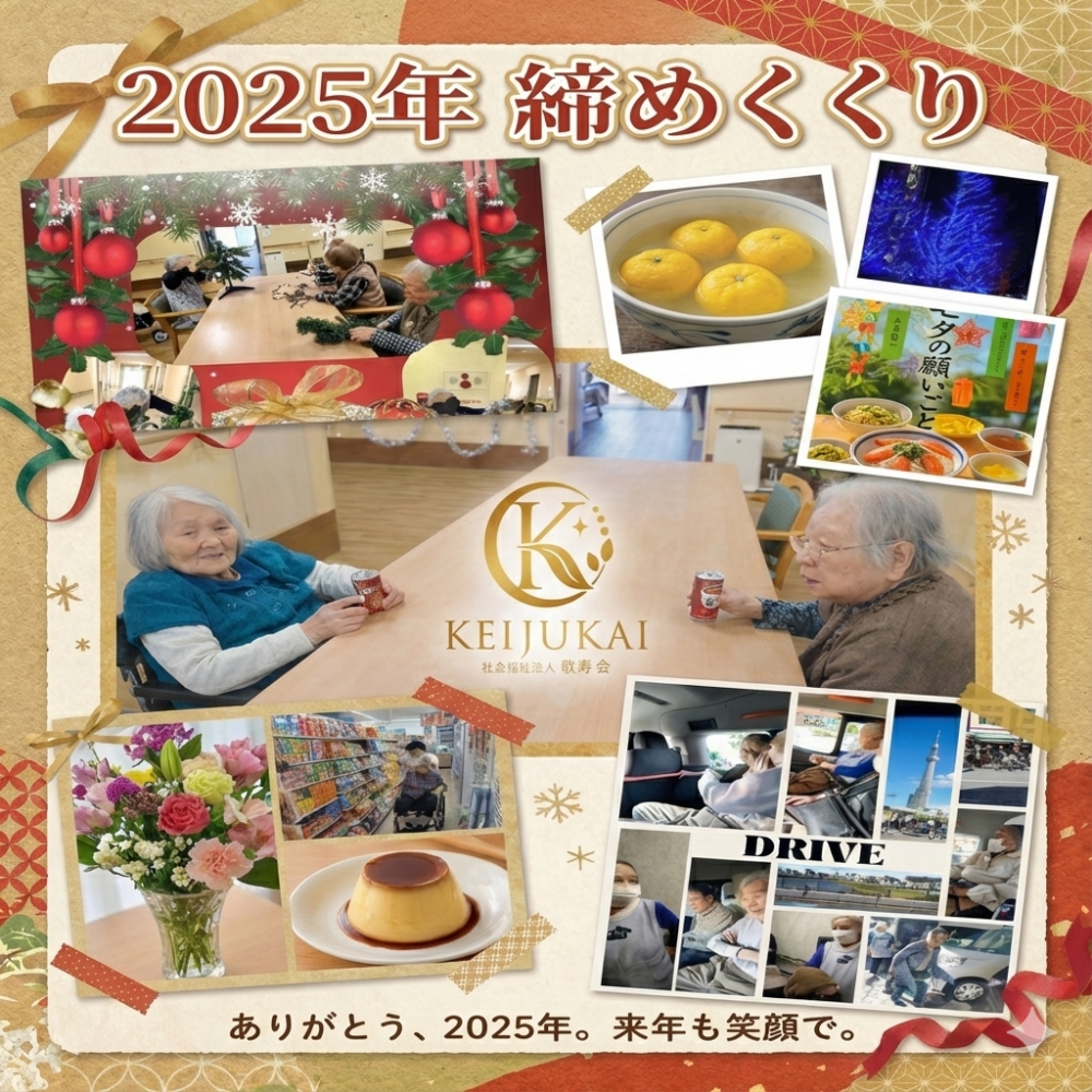 今年も一年、ケアハウス葛飾敬寿園をご支援いただきありがとうございました。ご入居者さま、ご家族さま、地域の皆さま、そして日々支えてくださる職員のみんなのおかげで、無事に一年を過ごすことができました。