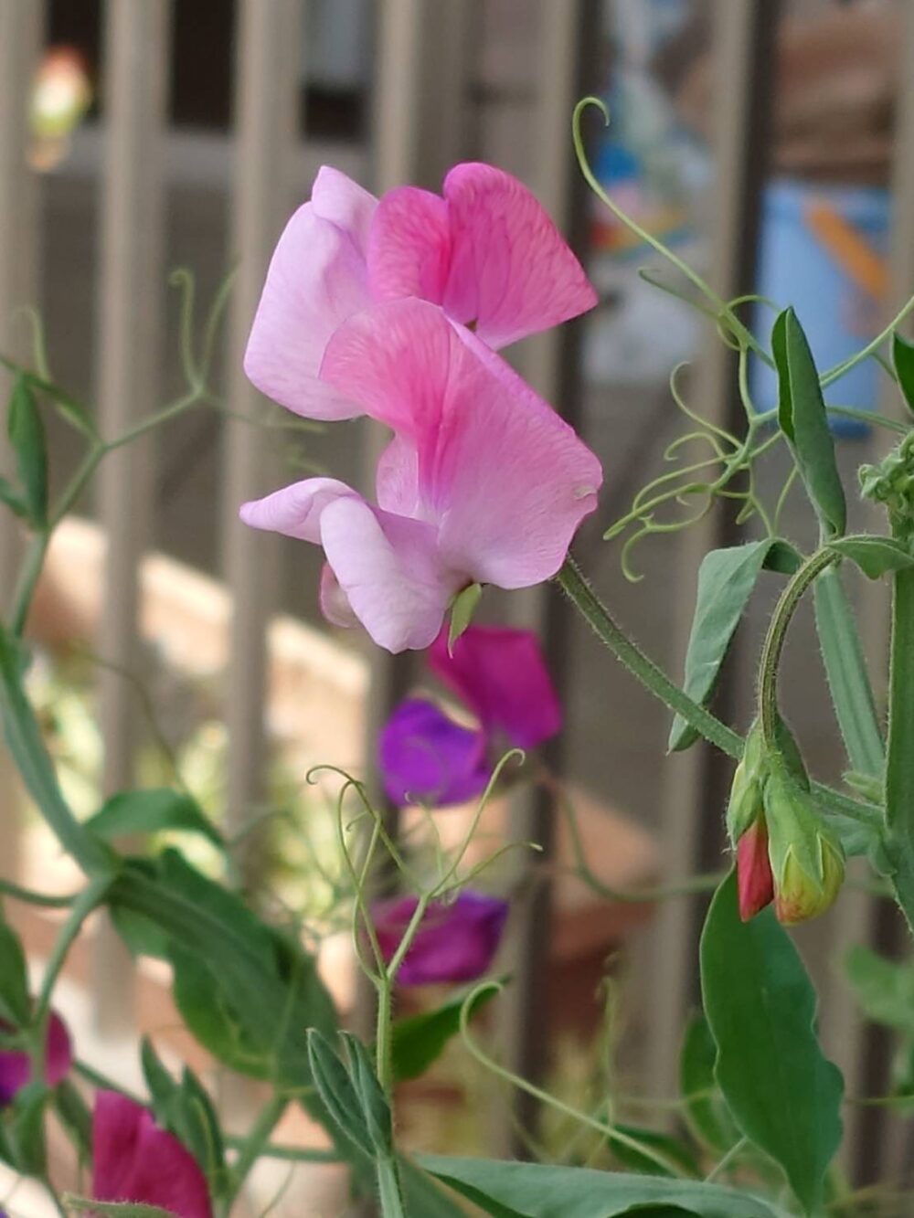 2階ベランダのスイートピーに、かわいいピンクのお花が咲きました💗