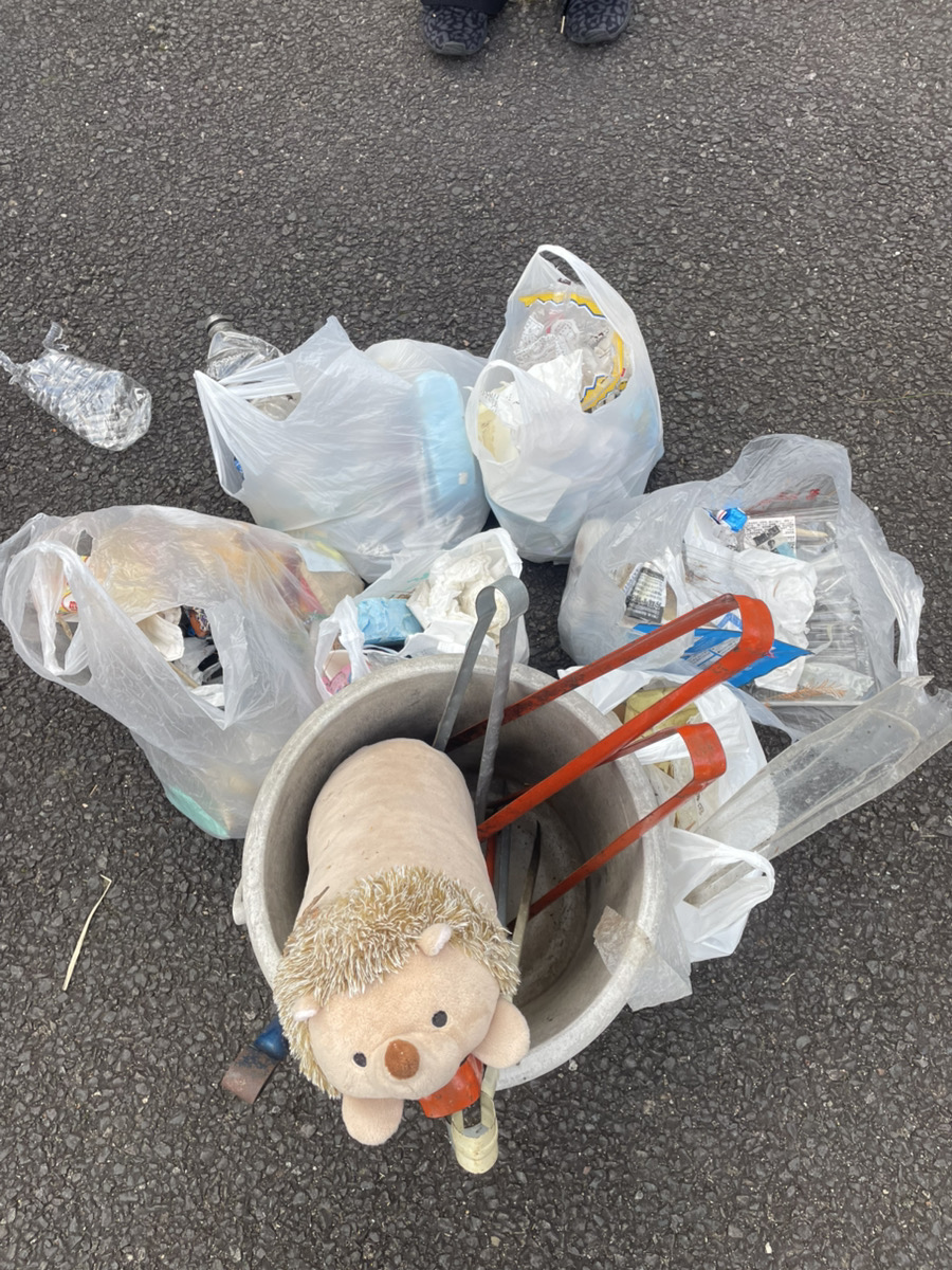 捨てられた? 落とした? 逃げ出した? 謎のハリネズミくんの登場で、寒い中でも「ほっこり」の清掃活動でした。
