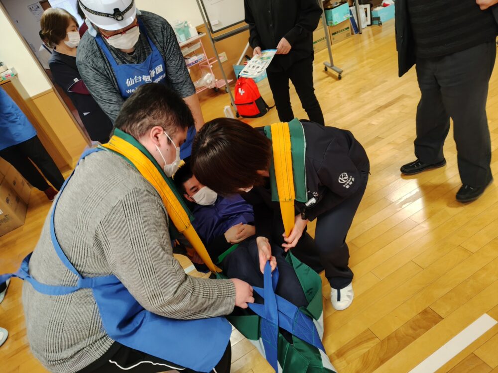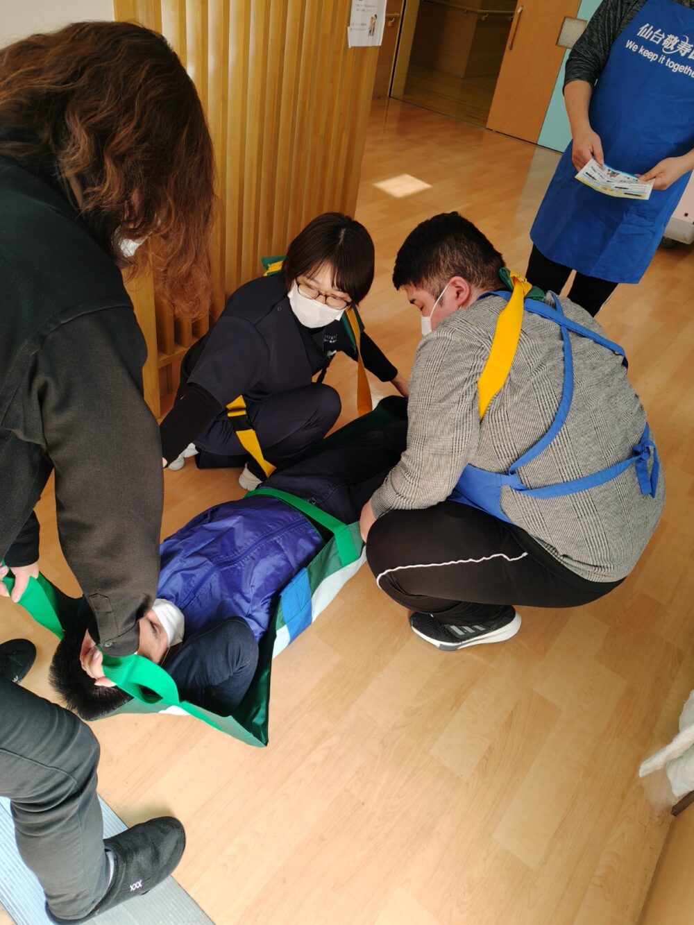 呼吸をしっかりあわせないと、利用者様の落下?!の危険もはらむ、見た目以上に、難しく危険な訓練です。実際に体験することで、災害時のチームワークの重要性を再認識しました。