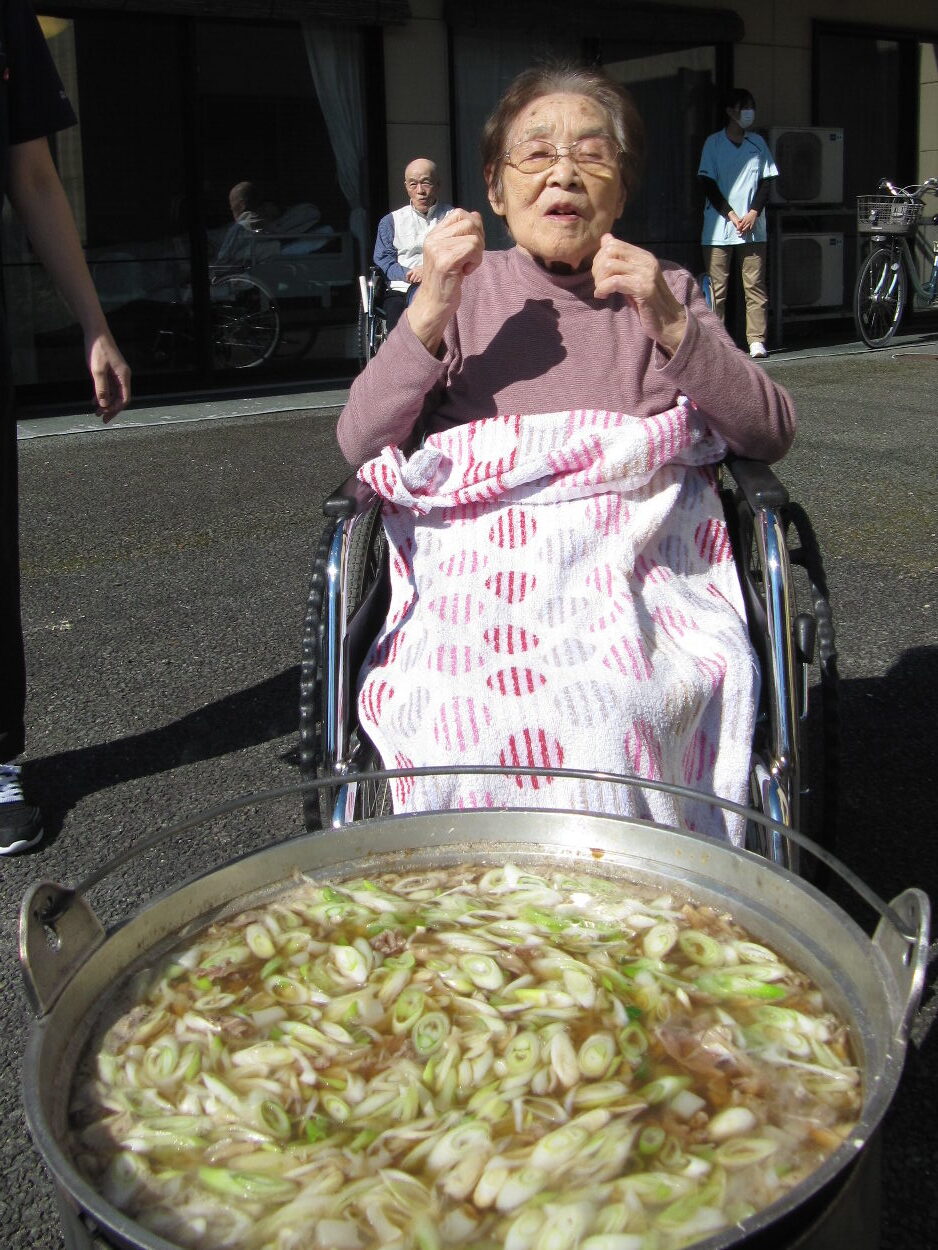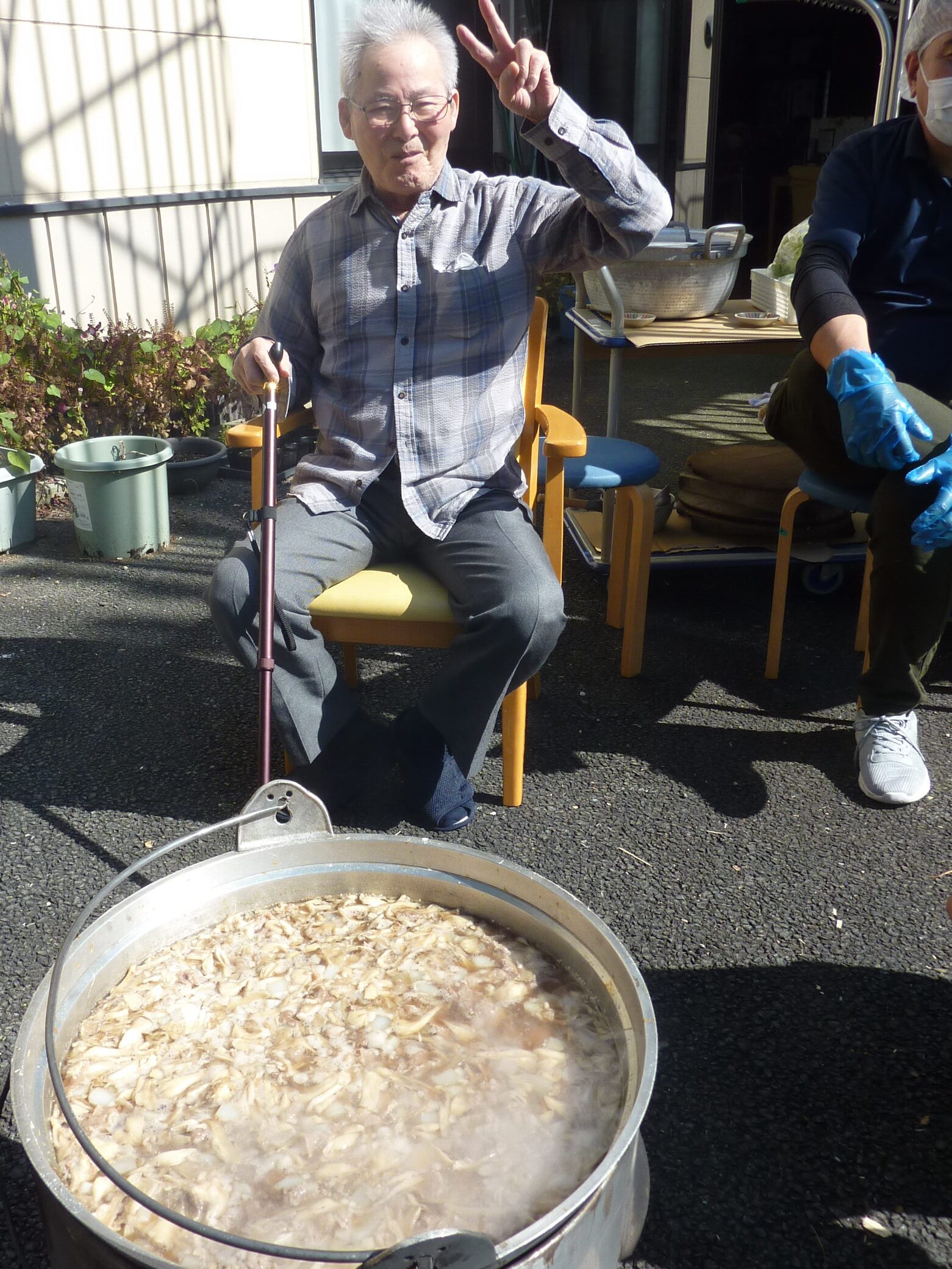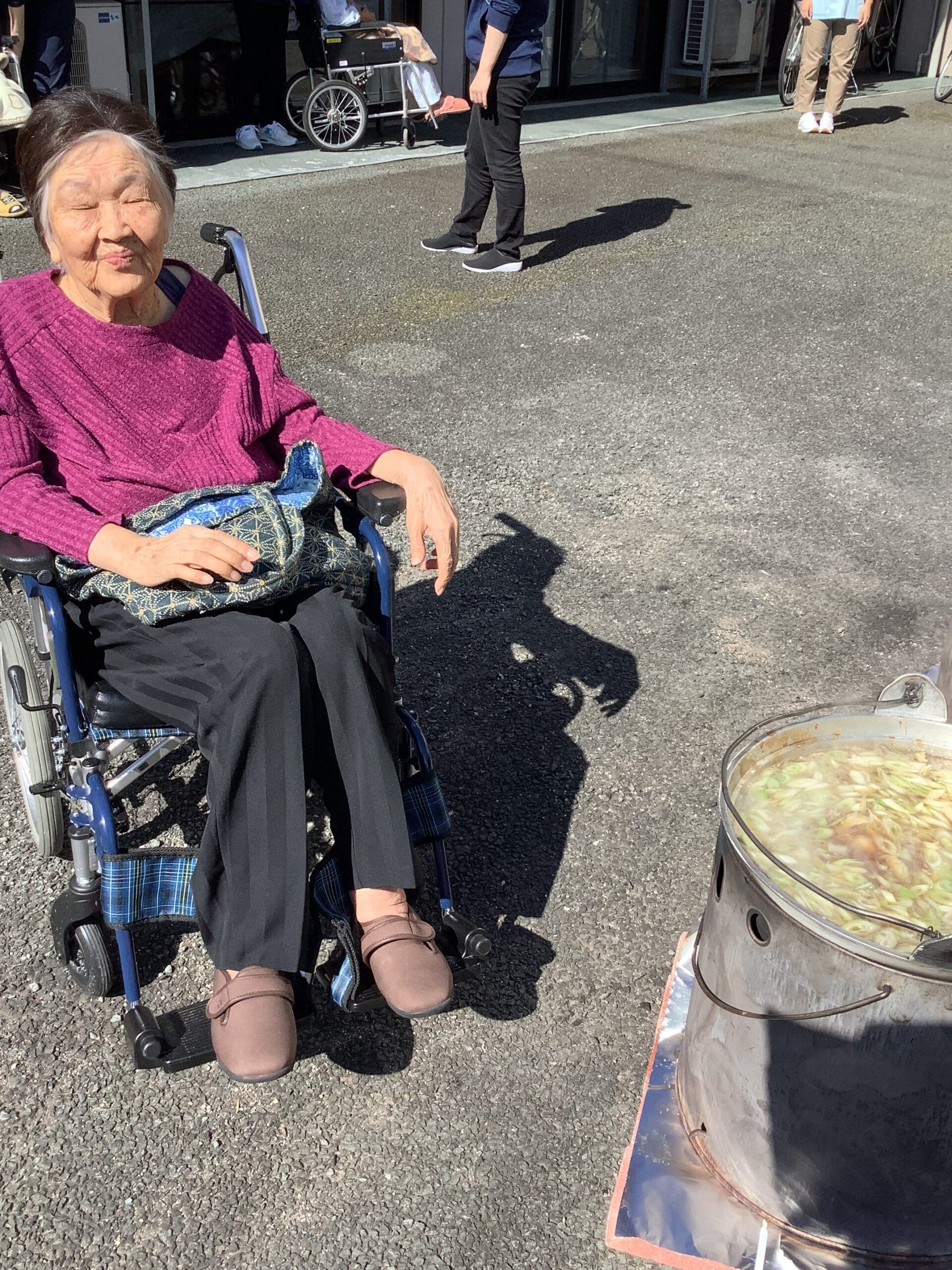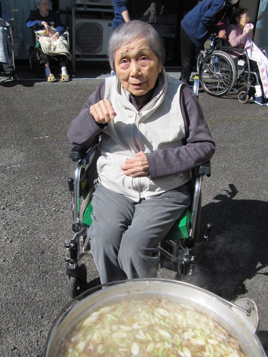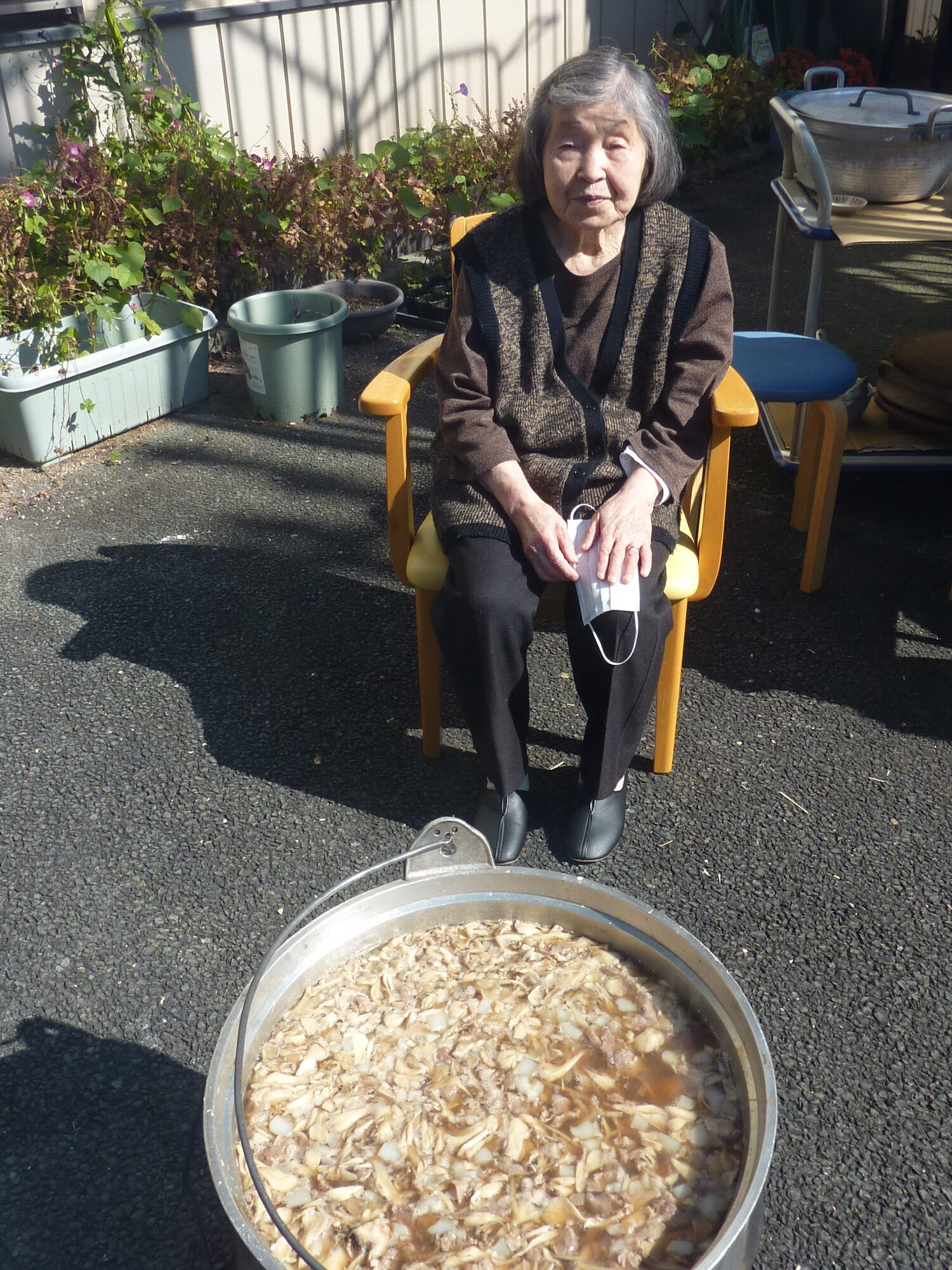 雲一つない秋晴れの陽気と芋煮の美味しい匂いに誘われて、ご利用者様が中庭に集合し