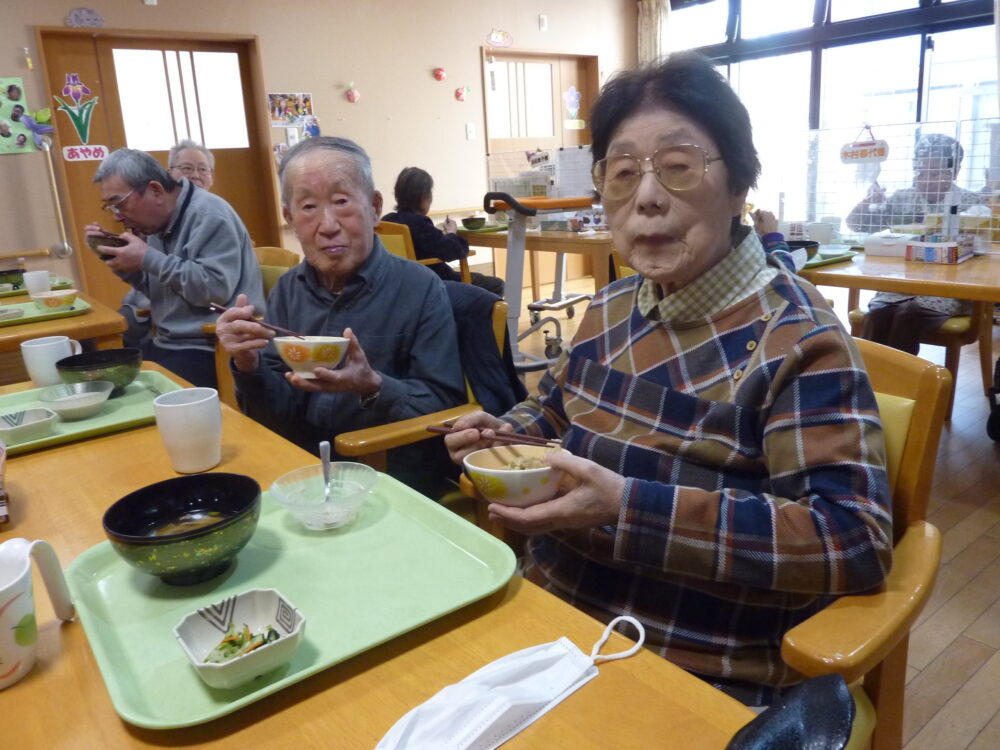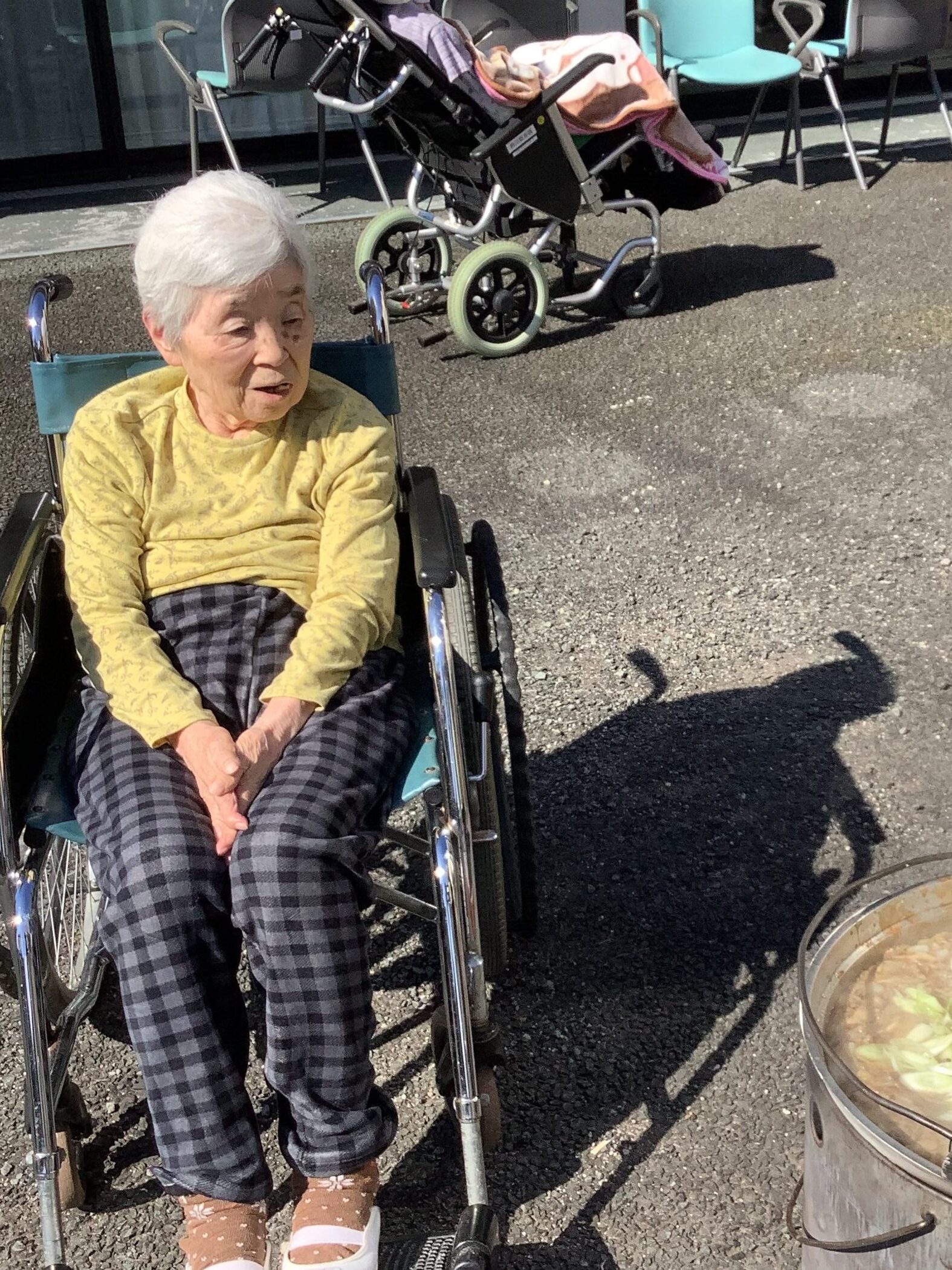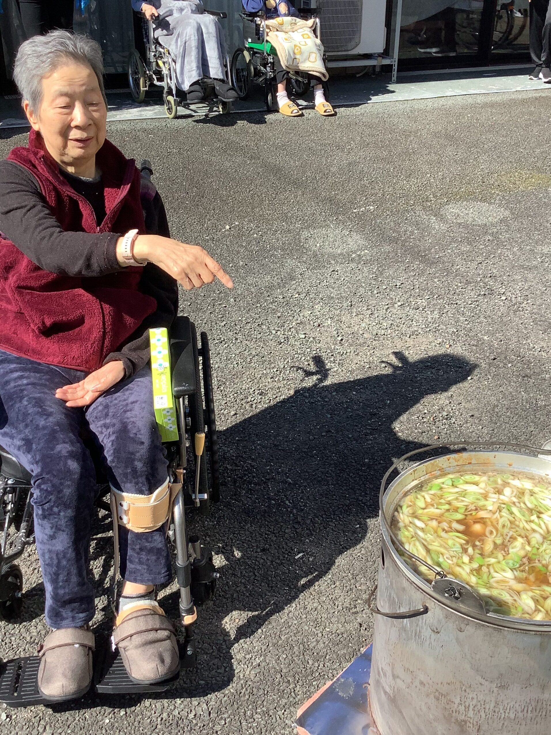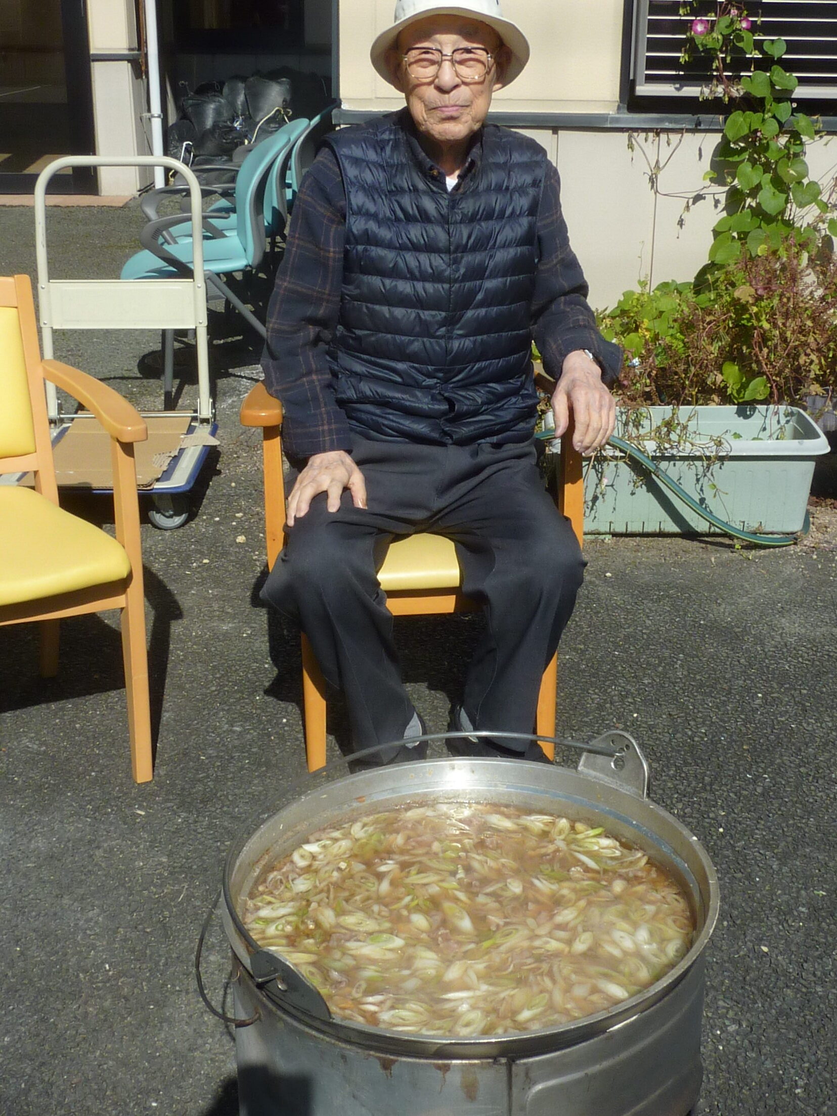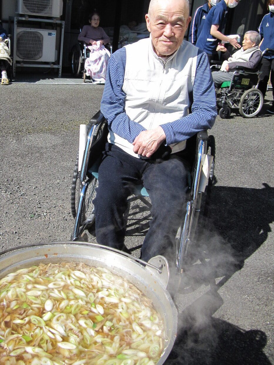 雲一つない秋晴れの陽気と芋煮の美味しい匂いに誘われて、ご利用者様が中庭に集合し
