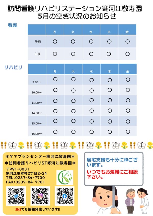 いつも大変お世話になっております。 5月に入り、新緑も鮮やかな季節となりました。皆様お変わりなくお過ごしでしょうか。だいぶご無沙汰となってしまいました。 寒河江敬寿園たより5月号を発行致しました。各拠点人員体制が変わり、心機一転となっております。 ぜひご覧ください。