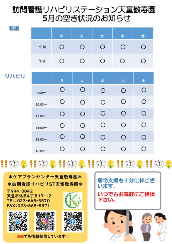 いつも大変お世話になっております。 5月に入り、新緑も鮮やかな季節となりました。皆様お変わりなくお過ごしでしょうか。だいぶご無沙汰となってしまいました。 天童敬寿園たより5月号を発行致しました。各拠点人員体制が変わり、心機一転となっております。 ぜひご覧ください。