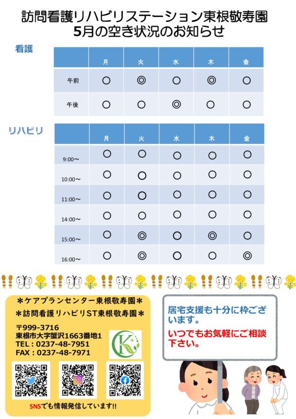 いつも大変お世話になっております。 5月に入り、新緑も鮮やかな季節となりました。皆様お変わりなくお過ごしでしょうか。だいぶご無沙汰となってしまいました。 東根敬寿園たより5月号を発行致しました。各拠点人員体制が変わり、心機一転となっております。 ぜひご覧ください。