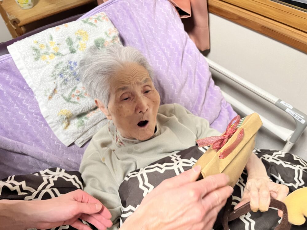 サンタクロースに扮した職員が登場し、入居者様お一人おひとりへ心を込めたプレゼントをお渡ししました。