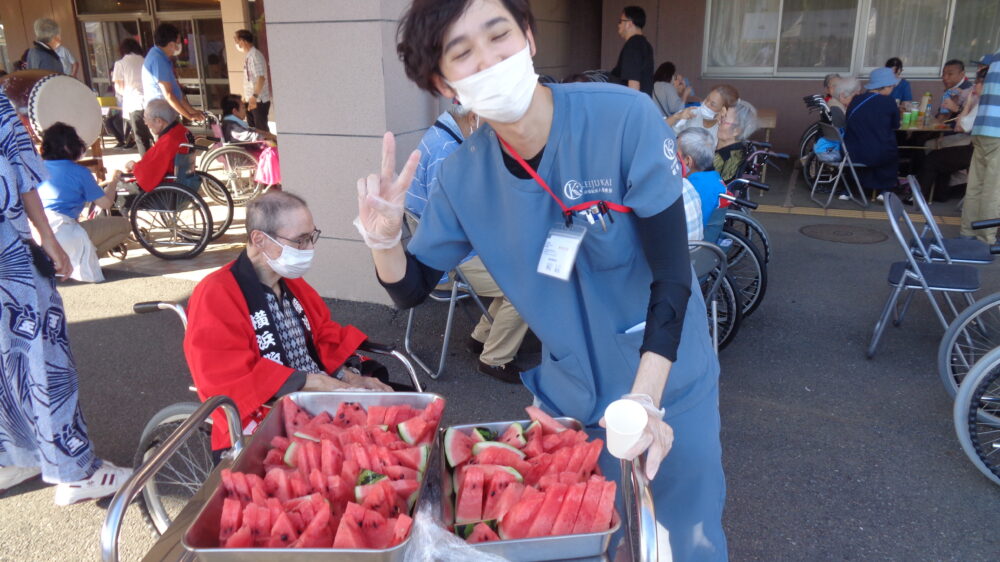 令和7年7月26日(土)、天気は快晴(ただし最高気温35度)、今年も地域の自治会(上泉西部自治会)さんと共催の横浜敬寿園夏祭りを開催いたしました。