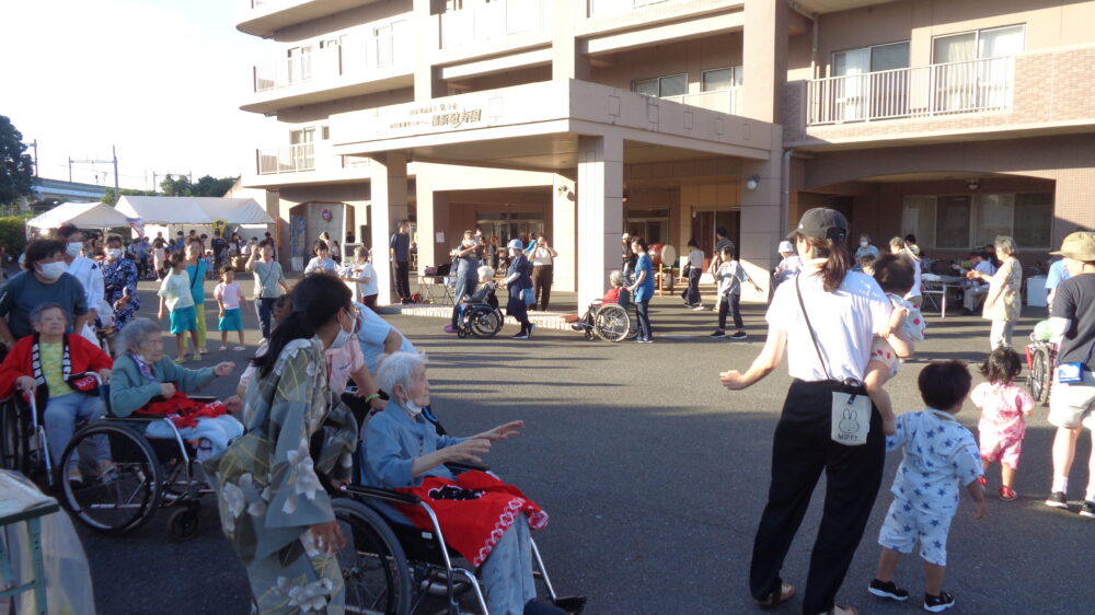 110名を超える家族様にご参加いただき、ご入居者様と一緒に屋台を回ったり太鼓を鳴らしたり。地域の方参加の『さくらんぼの種飛ばし競争』やみんなで輪になって盆踊りを踊ったりと、盛況のうちに終了する事が出来ました。